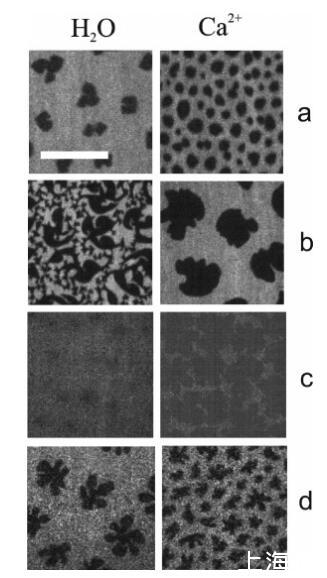 圖3:水上DPPC(a、b、c)和DMPS(d)單層的熒光圖像(左圖)和1 M CaCl2溶液(右圖),π)4 mN/M(a)、π)6.5 mN/M(b)、π)35 mN/M(c)和π)2 mN/M(d)。單分子膜用5 mol%羅丹明PE標(biāo)記:亮區(qū)對(duì)應(yīng)于LE相,暗區(qū)為L(zhǎng)C結(jié)構(gòu)域。比例尺代表15μm。所有圖像的對(duì)比度都相同。