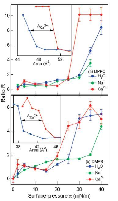 圖6:。作為DPPC(a)和DMPS(b)單分子膜表面壓力的函數(shù),CH3和CH2對(duì)稱拉伸振子強(qiáng)度的比值R:純水(藍(lán)色)、1 M NaCl溶液(綠色)和1 M CaCl2溶液(紅色)。由于單分子膜的崩塌,在π)40 mN/m時(shí),無(wú)法測(cè)定Na+-DPPC的比值R。由于壓縮單層膜的νsCH2振幅的不確定性,在較高壓力下,誤差條較大。插圖顯示了作為每種脂質(zhì)面積函數(shù)顯示的比率R。請(qǐng)注意~4?2/脂質(zhì)置換(解釋為Ca2+足跡),與圖2中的等溫線一致。