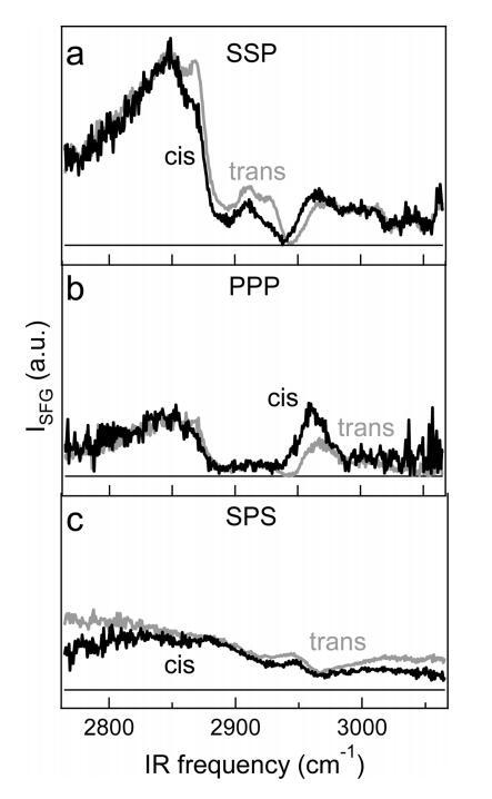 圖5:。(a)在P的反式和順式狀態(tài)下,DT-Azo-5P的純單層在65?2處的歸一化VSFG光譜與SSP極化分別為6和20 mN/m。(b)與a部分類似,但PPP極化。(c)反、順態(tài)SPS極化中的SFG譜(~每分子78?2),壓力為2和15 mN/m。三個面板具有相同的垂直刻度。