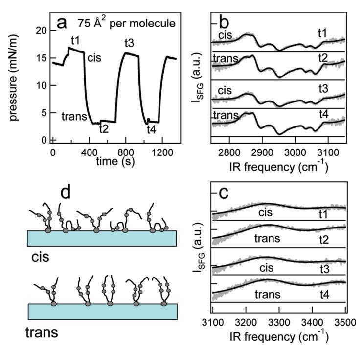 圖4:(a)在每分子75?2的面積處,脂質(zhì)/H2O界面處的光開關(guān)脂質(zhì)的表面壓力作為時間的函數(shù)。370和450 nm光照射~100秒分別產(chǎn)生cis(高壓)和trans(低壓)狀態(tài)。壓力的微小劇烈波動是由于樣品高度的變化,以校正水的蒸發(fā)。(b和c)CH和OH區(qū)域(灰色)中相應(yīng)的VSFG光譜,以及洛倫茲線形狀模型的擬合(見正文)。為了清晰起見,對光譜進(jìn)行了偏移。t1至t4對應(yīng)于面板a中進(jìn)行光譜測量的時間。(d)脂質(zhì)尾部方向示意圖。光開關(guān)脂質(zhì)的偶氮苯部分用灰色圓圈表示。