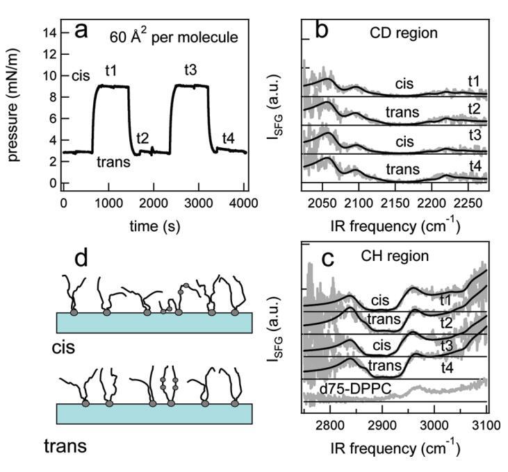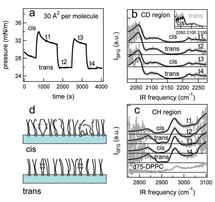 圖7:。結(jié)果:對于1:5的DT Azo-5P/d75 DPPC混合物,在脂質(zhì)/水界面上,每個分子的面積為30?2。(a)表面壓力與時間的關(guān)系。370和450 nm光照射~100秒分別產(chǎn)生cis(高壓)和trans(低壓)狀態(tài)。壓力的微小劇烈波動是由于樣品高度的變化,以校正水的蒸發(fā)。順式狀態(tài)下表面壓力的降低可能是由于單層的松弛或膠束或囊泡的形成減少了表面的脂質(zhì)量。(b)相應(yīng)的VSFG光譜(灰色)以及CD區(qū)域的擬合。為了清晰起見,對光譜進(jìn)行了偏移。插圖顯示了相互重疊的反式和順式光譜,以強(qiáng)調(diào)差異。(c)VSFG光譜(灰色)與fits一起引導(dǎo)眼睛進(jìn)入CH區(qū)域。底部曲線顯示了P下純d75 DPPC的光譜~40 mN/m.(d)脂尾方向示意圖。光開關(guān)脂質(zhì)的偶氮苯部分用灰色圓圈表示。