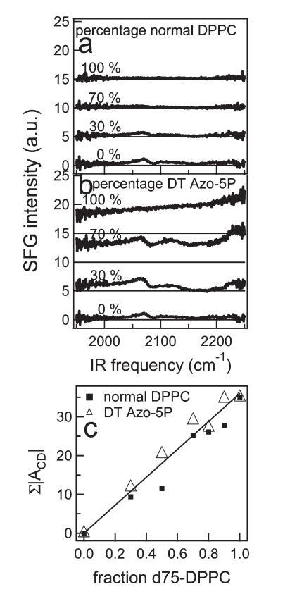 圖9:。(a)正常DPPC和d75 DPPC不同混合物的CD區(qū)VSFG光譜。圖中給出了混合物中正常DPPC的百分比。為清晰起見,光譜偏移,細(xì)線表示零。(b)與a部分類似,但適用于DT Azo-5P與d75 DPPC的混合物。(c)通過擬合VSFG光譜獲得的CD振動振幅之和,如文中所述,作為含正常DPPC或DT Azo-5P的二元混合物中分?jǐn)?shù)d75 DPPC的函數(shù)。在本實(shí)驗(yàn)中,為了獲得混合物的高質(zhì)量數(shù)據(jù),紅外注量很高,導(dǎo)致通過VSFG光譜中相對較高的CH2和CD2振幅觀察到的脂質(zhì)尾部出現(xiàn)小的無序。