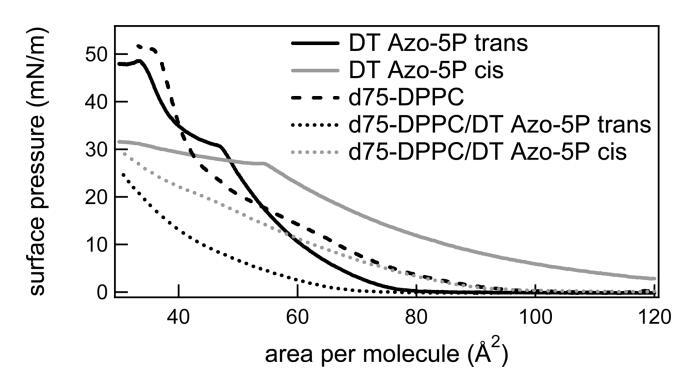 圖2:反式和順式狀態(tài)下的光開關(guān)脂質(zhì)DT Azo-5P的表面壓力與面積等溫線(實(shí)線),d75-DPPC的表面壓力與面積等溫線(虛線),以及光開關(guān)兩種狀態(tài)下的1:5摩爾比的光開關(guān)脂質(zhì)與d75 DPPC的表面壓力與面積等溫線(虛線)。