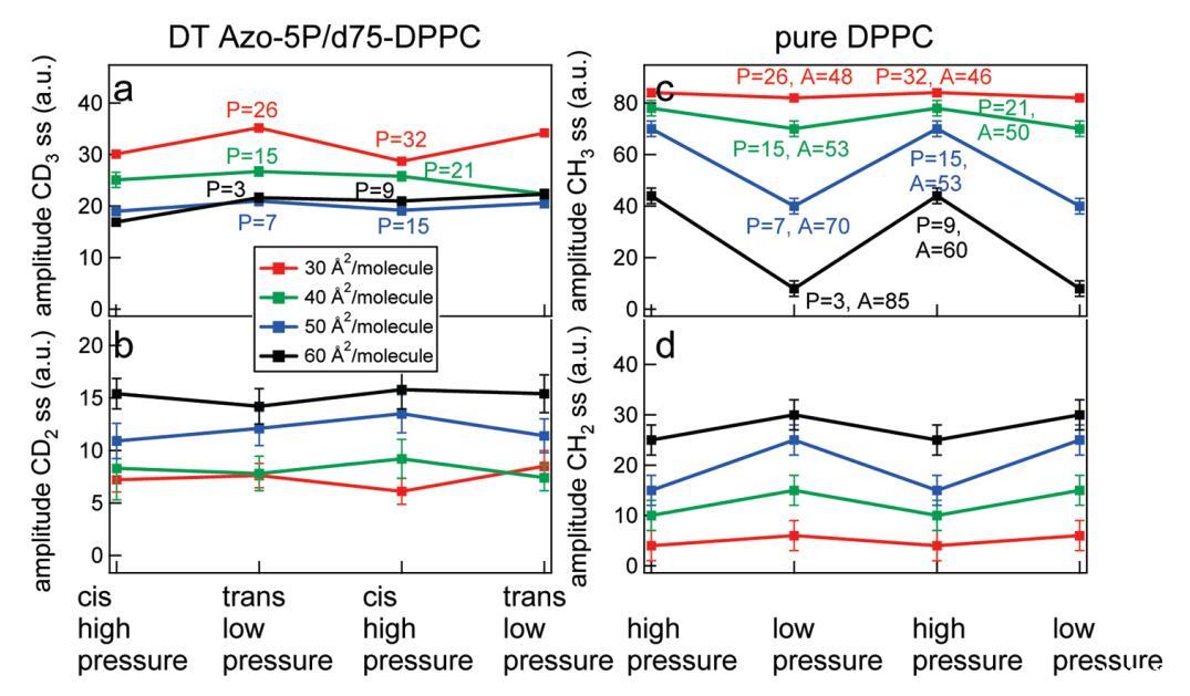圖8:。d75 DPPC與DT Azo-5P比例為5:1的實(shí)驗(yàn)中d75 DPPC的擬合結(jié)果(左)和純正常DPPC的擬合結(jié)果(右)。(a)CD3對稱拉伸振動模式的振幅隨不同密度光開關(guān)脂質(zhì)狀態(tài)的變化;(b)CD2對稱拉伸振動模式的振幅隨不同密度光開關(guān)脂質(zhì)狀態(tài)的變化;右圖顯示了純DPPC在可比壓力下與左圖相似的結(jié)果,其中(c)為CH3對稱拉伸振動模式的振幅,(d)為CH2對稱拉伸模式的振幅。共振的寬度和頻率在擬合中是固定的。