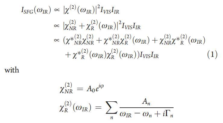 圖3:。在密度為75?2/分子和壓力為~3 mN/m。共振信號疊加在大型非共振背景上,由于共振信號和非共振信號之間的干擾,導(dǎo)致色散線型。黑色虛線表示NR振幅設(shè)置為零時的DT Azo-5P信號。