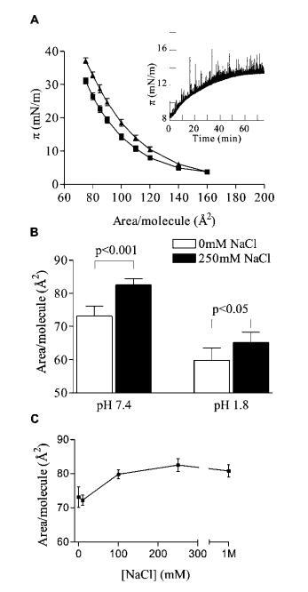 圖1:。NaCl對(duì)PIP2單分子膜的擴(kuò)張效應(yīng)。(A)π-含0 mM(9)和250 mM NaCl(2)的等溫線;(插圖)亞相注入250 mM NaCl(時(shí)間)0時(shí),恒定面積/分子的表面壓力變化。(B)在pH 1.8(n)7)和pH 7.4(n)5)條件下,30 mN/m的每個(gè)分子的面積。(C)對(duì)亞相NaCl的劑量反應(yīng)。誤差條為平均值(n處為SE)5,除非另有說(shuō)明。所有數(shù)據(jù)均為HEPES緩沖亞相的L-R PIP2,pH 7.4(除非另有說(shuō)明),30°C。