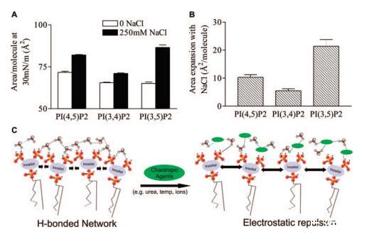 圖5:。亞相氯化鈉膨脹效應(yīng)的PIP2異構(gòu)體特異性。(A)HEPES緩沖亞相上的DO-PIP2異構(gòu)體在π)30 mN/m時(shí)的每分子面積。平均值(SE,n)7。(B)250 mM NaCl和無(wú)亞相NaCl之間DOPIP2異構(gòu)體的每分子面積差異。通過(guò)雙向ANOVA測(cè)量,NaCl效應(yīng)的異構(gòu)體依賴(lài)性顯著達(dá)到p)0.0001。(C)PIP2分子間相互作用的概念動(dòng)畫(huà)。在沒(méi)有潮向性試劑(綠色橢圓)的情況下,PIP2分子形成水介導(dǎo)的氫鍵網(wǎng)絡(luò)。當(dāng)添加潮向性聚合物時(shí),網(wǎng)絡(luò)被破壞,帶電磷酸鹽之間的靜電排斥導(dǎo)致單層的膨脹。