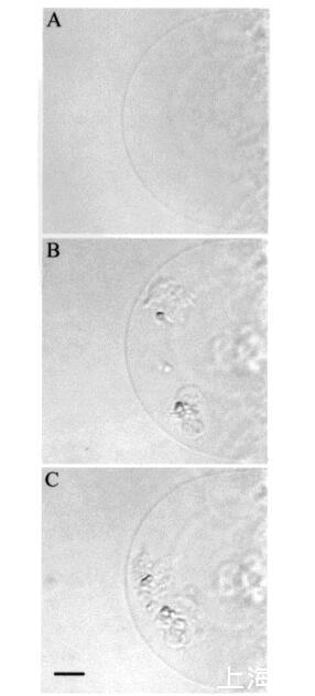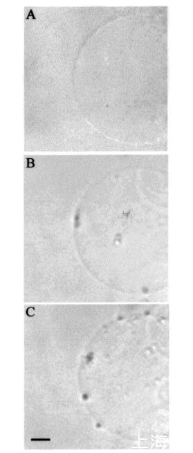 時間蛋白對膜拓撲結構的影響。巨大脂質體是生物膜的優(yōu)秀模型,因為其尺寸與細胞相當。此外,它們可以通過光學顯微鏡進行觀察(15,21)。我們之前對馬加寧2和吲哚肽的研究表明,這些肽對巨大脂質體膜的拓撲結構有顯著影響(15)。在本研究中,在類似條件下,通過顯微鏡觀察了在巨大囊泡外表面添加這些肽后,temporins對巨大脂質體三維拓撲結構的影響。SOPC巨脂質體即使暴露于大量該肽(約1.2 fmol的temporin B)(每個重復100份12 amol)時,也不受temporin B的影響。同樣,含有膽固醇(Xchol)0.10)的巨大囊泡也不受該量的顳葉素B的影響。然而,在將該肽添加到SOPC和SOPC/膽固醇(Xchol)0.10)巨大脂質體的表面時,偶爾會觀察到相鄰囊泡之間的粘附(數據未顯示)。然而,在POPG(XPOPG)0.10的存在下,已經≈36 amol(10-18 M)的顳葉素B(約60 fL,3次注射)施加在巨大囊泡表面上,引起巨大囊泡膜拓撲結構的顯著變化(圖6,面板B)。具體來說,小顆粒(φ≈10μm),然后進入巨大脂質體的內腔(圖6,面板B)。進一步增加≈0.24 fmol的顳蛋白B(約400 fL,20次注射)導致巨大囊泡內這些顆粒的數量增加(圖6,面板C)。還觀察到巨大囊泡表面的顆粒聚集(圖6,面板C)。隨后,在≈10分鐘后,將顆粒轉移到巨大脂質體的內腔中。