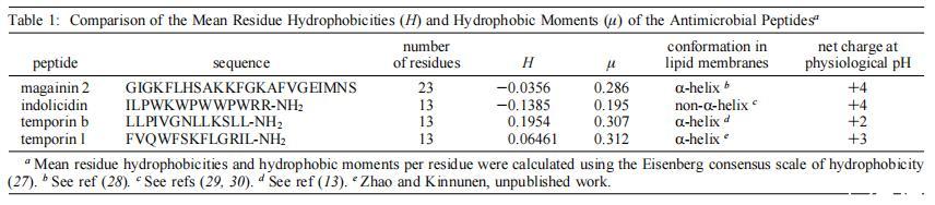 我們的長期目標是建立最低的序列要求,這可以進一步作為設計新型抗菌肽類似物的指導原則。我們之前已經比較了兩種抗菌肽,馬蓋寧2和吲哚肽對本研究中使用的相同模型膜系統(tǒng)的影響,即。,單層、脂質體和巨大囊泡(15)。我們早期研究中使用的肽是選擇的,因為它們代表兩種不同類型的抗菌肽家族。在本研究中,我們使用了兩種13個氨基酸的肽,即與吲哚肽長度相似的肽。肽的結構參數不同,如電荷、構象、疏水性、疏水力矩和大小(表1)。有趣的是,在所研究的四種肽中,以摩爾為基礎計算的時間蛋白L最有效,作用于中性和酸性磷脂膜。與其他三種肽相比,其凈陽離子電荷和疏水性具有平均值(表1)。然而,在所示的肽中,temporin L具有最高的平均疏水力矩,這表明這可能是與其有效的膜擾動作用相關的一個重要參數,這與之前比較magainin 2和其他抗菌肽的研究一致(31)。