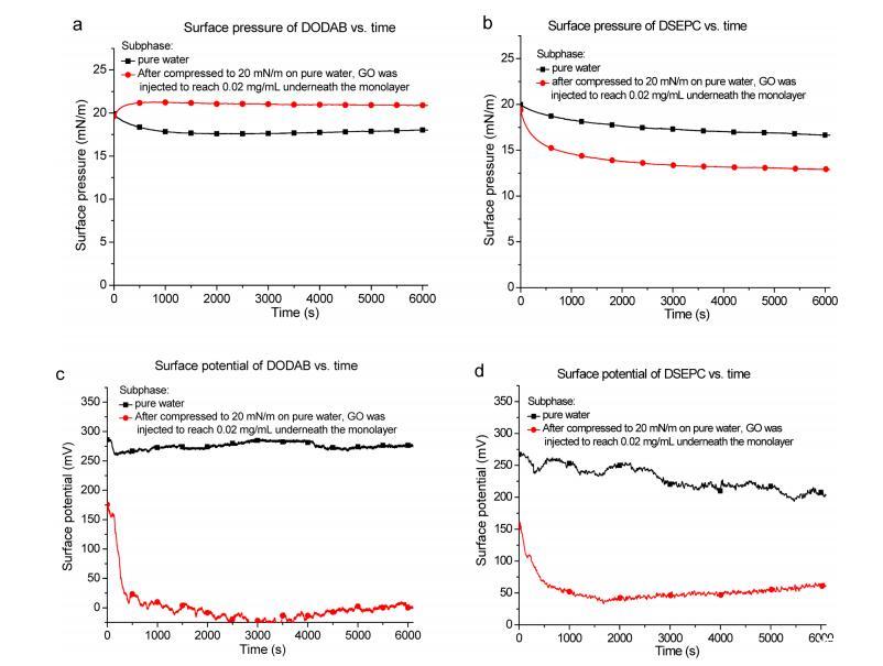 圖2:(a)DODAB和(b)DSEPC單層的表面壓力與經(jīng)過時(shí)間。(c)DODAB和(d)DSEPC單層的表面電位與經(jīng)過時(shí)間的關(guān)系。黑色曲線:在純水亞相上將單層壓縮至20 mN/m的表面壓力。紅色曲線:將單層壓縮至20 mN/m后,小心地將600μL 1 mg/mL GO分散液緩慢注入單層下方的水亞相中,使GO達(dá)到0.02 mg/mL。