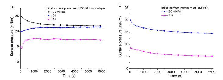 圖4.GO在不同表面壓力下對(duì)(a)DODAB和(b)DSEPC單層的吸附研究(表面壓力與經(jīng)過時(shí)間的關(guān)系)。首先將單層壓縮至純水亞相上的一定表面壓力,然后小心地將600μL 1 mg/mL GO分散液緩慢注入單層下方的水亞相。