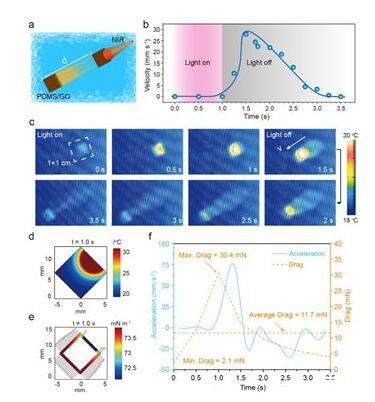 研究人員研制的驅(qū)動薄膜中具有光熱效應極好的氧化石墨烯(GO)材料,可將光能轉(zhuǎn)換成熱能,當光照射漂浮于水面上的驅(qū)動薄膜時,薄膜會產(chǎn)生一定的溫度并傳遞給周圍的液體,造成局部水溫升高進而影響水的表面張力。
