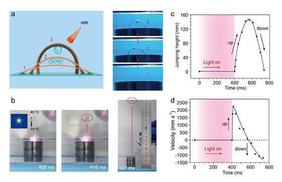 光刺激下驅(qū)動器可以在極短的響應時間(400 ms)內(nèi)從液體介質(zhì)跳越到空氣中,最高速度為2 m/s,高度可達14.3 cm。