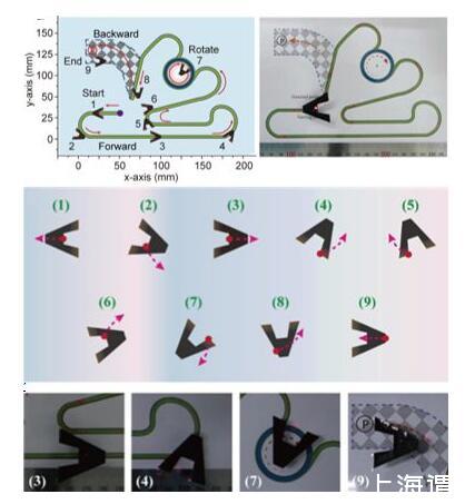 前進后退解決之后,就該考慮薄膜在遇到彎道時的轉(zhuǎn)彎問題,如何做到薄膜在向前游動的同時方向還可以轉(zhuǎn)變呢?通過計算薄膜轉(zhuǎn)彎時合力的方向,我們很快就設計出分力所存在的位置,于是在梯形的基礎上裁掉一塊梯形面積后,通過照射特定的部位就可以實現(xiàn)各類游動行為。