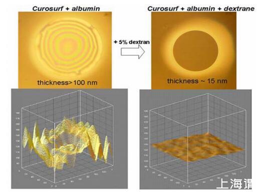 當(dāng)通過Survanta和白蛋白添加到混合FFs中時(shí),葡聚糖不會(huì)改變膜的性質(zhì)。然而,當(dāng)FFs中包含PEG 10000時(shí),富含白蛋白的厚膜分解成更小的厚“島”,島之間有薄的(h=17 nm)黑色區(qū)域(圖4)
