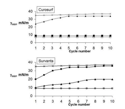 圖1.Curosurf(上圖)和Survanta(下圖)單層的最小表面張力(γmin)對(duì)壓縮/減壓循環(huán)次數(shù)的依賴性。符號(hào)表示:□-純空氣/水界面處的ESP(鹽水溶液亞相上);在BSA亞相上的x-ESPs(2mg/ml);■-在BSA(2mg/ml)和5%葡聚糖的亞相上進(jìn)行ESPs;▲-在BSA亞相(2mg/ml)和5%PEG 10000上進(jìn)行ESP。ESP作為脂質(zhì)體懸浮液擴(kuò)散,最終濃度為15μg磷脂/ml。實(shí)驗(yàn)在0.15 M NaCl、pH 6.8-7.0、T=25℃下進(jìn)行。