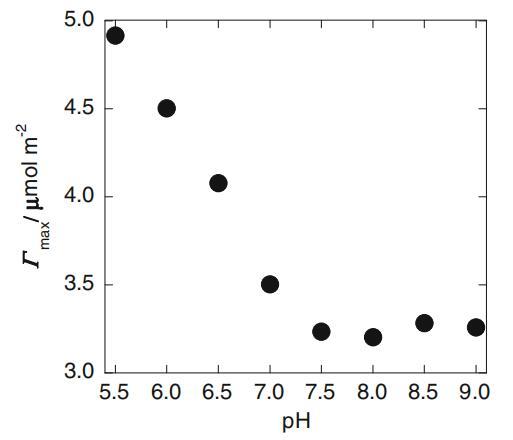 其中CS、R和T分別為表面活性劑總濃度、氣體常數(shù)和溫度。由于所有樣品溶液都含有過量的鈉鹽作為緩沖液并保持在恒定pH值,因此i值(濃度隨表面活性劑濃度變化的離子種類數(shù))取為1。圖5中繪制了最大值與pH值的關(guān)系圖。最大值在小于7.3的pH值下顯著增加,與cmc/C20比值的值相同。這些結(jié)果肯定表明,當(dāng)pH值降至7.3以下時,在溶液表面用H+替換SLAS的Na+,也就是說,在pH值>7.3時,NDO癸?;“彼彡庪x子的反陽離子(LAS?)是空氣-水界面處的所有Na+。因此,估計(jì)了H+LAS的pKa值?另一方面,在含水體中,我們根據(jù)不同SLAS濃度下的pH值,確定了含水體相中HLAS的pKa值為3.3,該pH值在氮?dú)夤呐莸娜セ鸺兯?。雖然我們還無法確定組裝的HLA的確切pKa值,因?yàn)樯形传@得HLA的最大值,但毫無疑問,其值大于含水體相中HLA單體的值3.3。一些文獻(xiàn)也報(bào)道了自組裝過程中pKa值的增加[12,13]。