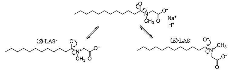 Bordes等人研究了氫鍵對甘氨酸鹽和肌氨酸鹽自組裝的影響[17]。Gad等人研究了具有不同碳鏈長度的N-?;“彼猁}的界面張力[3]。還對含有SLA的二元混合物與Gemini表面活性劑[18]和陽離子聚合物[19]進(jìn)行了一些界面研究。然而,這些研究沒有考慮它們的pH影響。Tsubone等人在pH值為10.5[20]時對SLA進(jìn)行了界面張力測量。然而,SLAS水溶液的界面張力在很大程度上取決于pH,在膠束前和膠束后區(qū)域中,當(dāng)pH小于約7時,其值顯著下降。cmc和C20在較低pH下也會降低,但cmc/C20比在pH<7.3時增加。該比值的增加通常意味著親水頭的尺寸增加和/或與反陽離子的締合增加。在pH<7.3時,Γmax也急劇增加。這些結(jié)果清楚地表明,在空氣-水界面的較低pH區(qū)域,SLA的Na+陽離子被H+取代。向溶液中加入Tl+,證實(shí)LAS的界面張力?并且它們以H+<Na+的順序增加,這與這些結(jié)果一致。此外,我們使用1H-NMR和13CNMR研究了D2O和CD3OD中HLA和SLA的結(jié)構(gòu)差異。根據(jù)這些結(jié)果,例如,來自LAS親水部分中1小時的所有信號?可以想象,HLA和SLA都具有共振結(jié)構(gòu),(Z)-LAS?和(E)-LAS?,如圖9所示。通過NMR[21,22]的膠束化也報(bào)告了這些SLAS異構(gòu)體的存在。根據(jù)分裂峰的積分比,Z/E形式的豐度比確定為SLA為1:1,HLA為2:1。由于E型比Z型體積大,這可能是Γmax隨pH值增加而減小的第二個原因,直到pH值為7.3。另一方面,除了RB的各向異性(在pH<7時明顯增加)外,含水體中的膠束性質(zhì)對pH的依賴性小于界面性質(zhì)。然而,在pH值降低時,聚集數(shù)和流體動力學(xué)半徑的小幅度增加趨勢以及膠束核的微極性的減小趨勢可以很好地解釋為LAS親水性頭基團(tuán)之間的靜電力減小?由Na+到H+的反陽離子置換引起,與界面性質(zhì)的情況相同。雖然我們尚未確定界面和膠束中HLA的pKa值,但這些值應(yīng)大于水溶液中的pKa值(pKa,bulk=3.3);界面處的值可能略大于膠束中的值。pH<7時體積較小的Z型的增加也與膠束性質(zhì)相容,并可能與膠束親水部分附近RB各向異性的增加直接相關(guān)。