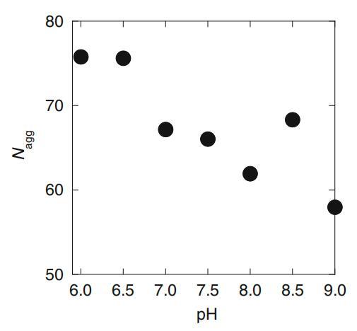 為了評估膠束(Nagg)的聚集數(shù),我們使用帶有猝滅劑(HPYL)的探針(Py)的穩(wěn)態(tài)熒光猝滅方法[8]。已發(fā)現(xiàn)該探針-猝滅劑對適用于評估幾種膠束系統(tǒng)的Nagg[14,15]。Cs=25 mM時的評估Nagg值如圖7所示。如圖所示,Nagg數(shù)值總體上隨著pH值的增加而降低。然而,似乎在pH 6.5-7附近也存在一個斷裂點(diǎn)。如果是這樣,膠束中HLA的pKa預(yù)計(jì)在6.5到7.0之間,這也比水溶液中的pKa大,就像空氣-水界面的結(jié)果一樣。為了進(jìn)行進(jìn)一步討論,我們需要更精確地確定這些Nagg值。