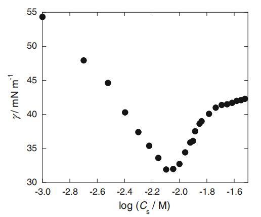 通過測量磷酸鹽和硼酸鹽緩沖液水溶液中的界面張力、熒光、動態(tài)光散射等,研究了陰離子表面活性劑正十二烷基肌氨酸鈉(SLAS)的pH依賴性。SLAS的界面張力(γ)隨著pH值的降低而顯著降低,并在pH>7.3時保持恒定。臨界膠束濃度(cmc)和表面活性劑濃度(在其γ值比純水(C20)降低20 mN/m時)的觀察值隨著pH值降低而降低,而在pH>6.5和>7.3的情況下也分別保持恒定。另一方面,當(dāng)pH<7.3時,SLAS的界面過量增加。通過添加取代SLAS的Na+的Tl+進(jìn)一步研究了這些界面行為。LAS的觀測γ值?考慮到靜電相互作用和親水性頭基的分子結(jié)構(gòu),詳細(xì)討論了這些界面和膠束性質(zhì)。