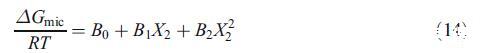 通過使用等式16,可獲得參數(shù)B2,隨后可從等式17獲得B1。表2顯示了B0、B1和B2的值。本混合系統(tǒng)報(bào)告的B1值為?7.91.B1的大負(fù)值表明烴鏈-鏈相互作用對(duì)混合膠束的穩(wěn)定性也起著重要作用。Maeda還報(bào)告了不同二元混合物的負(fù)和正B1值,并得出結(jié)論,鏈-鏈相互作用和頭部基團(tuán)的空間不相容性是這些變化的原因[21]。根據(jù)等式14和表2的參數(shù),我們?cè)u(píng)估了膠束形成的自由能(數(shù)據(jù)未顯示)。這些評(píng)估值接近從偽相分離模型獲得的值(表1)。