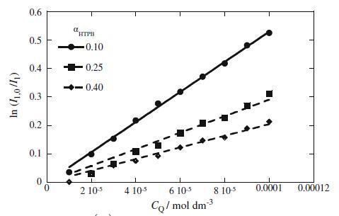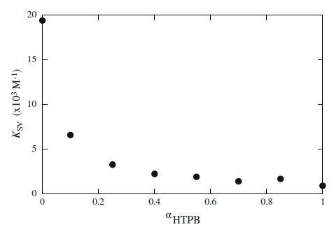KSV值根據(jù)公式20(數(shù)據(jù)未顯示)的斜率進(jìn)行評(píng)估,如圖6所示。圖6顯示KSV的值隨著HTPB成分含量的增加而降低,反映出熒光團(tuán)變得更難接近猝滅劑。據(jù)報(bào)道,隨著陽離子gemini表面活性劑摩爾組成的增加,KSV降低[24]。