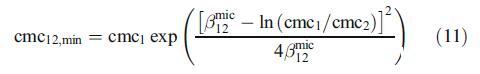 另一方面,在混合膠束形成過程中,含有兩種表面活性劑的混合物中協(xié)同作用的存在不僅取決于它們之間相互作用的強(qiáng)度,還取決于二元兩親混合物中單個(gè)表面活性劑組分的相關(guān)性質(zhì)[23]。因此,混合膠束形成中協(xié)同作用所需的條件是bmic 12必須為負(fù)(見上節(jié)),且βmic 12>jlnecmc1=cmc2Tj(表2)。對(duì)于本二元混合物,這兩個(gè)條件都滿足?;旌夏z束形成中可能的協(xié)同程度通過混合表面活性劑的摩爾濃度與單個(gè)組分的摩爾濃度相比的最大降低來測(cè)量,即(cmc1)?cmc12,min)/(cmc1),其中cmc12,min是混合表面活性劑的最小cmc,由下式給出: