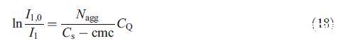 為了評(píng)估Nagg,我們使用了實(shí)驗(yàn)部分[26]中所述的猝滅劑(CPYC)對(duì)探針(芘)的穩(wěn)態(tài)熒光猝滅。該方法基于已知濃度的猝滅劑對(duì)發(fā)光探針的猝滅。已發(fā)現(xiàn)該探針-猝滅劑對(duì)適用于評(píng)估幾種膠束系統(tǒng)的Nagg[3,15–17,24,27]。使用以下方程[26]分析淬火實(shí)驗(yàn):