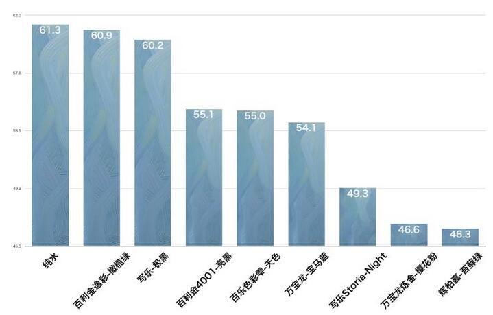 1.達(dá)到60mm接近純水的【高流動(dòng)性組】,代表樣本為【百利金逸彩橄欖綠】、【寫樂極黑】;