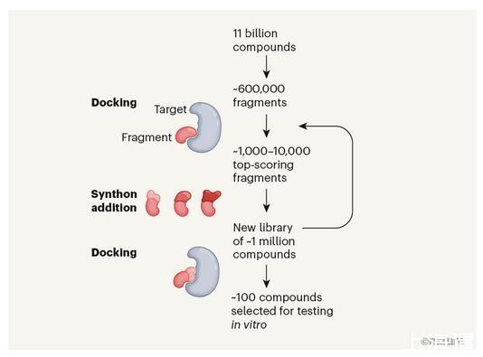 通過重復(fù)對接和添加合成子的步驟,篩選幾百萬個化合物來確定hits。隨著每一次迭代,每個化合物的大小都會隨著分子變得更加完整而增加。