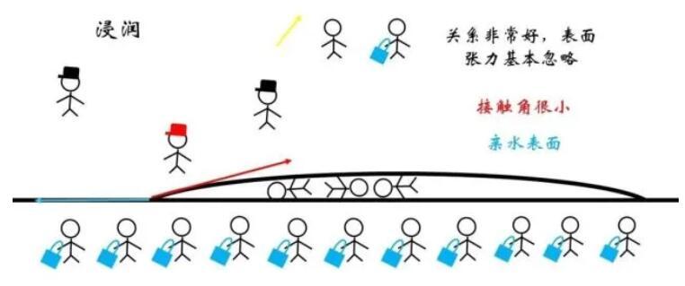 對(duì)于浸潤(rùn)的情況,液體與固體物質(zhì)間的關(guān)系很好,最為極端地可以認(rèn)為該界面處的表面張力小到可以忽略。這樣一來,需要紅色和藍(lán)色的力的水平分量達(dá)到平衡,液滴的形狀趨于扁平。一般將氣液界面處張力與液固界面的夾角稱為接觸角,對(duì)于浸潤(rùn)現(xiàn)象顯著的親水表面接觸角很小。