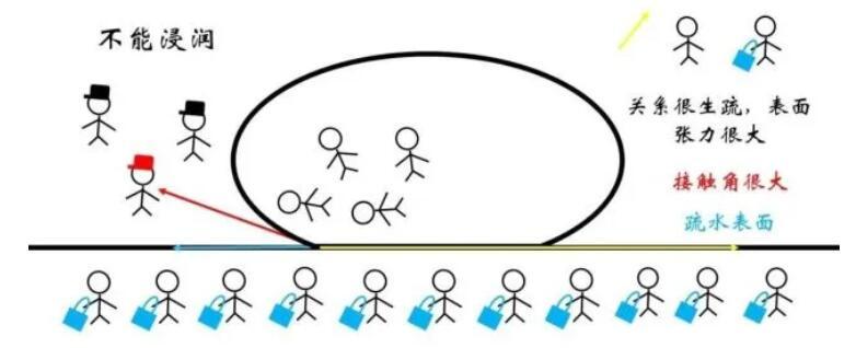 反之,對(duì)于疏水表面,固液界面處的表面張力可能非常大,以至于接觸角只有達(dá)到鈍角甚至趨近于180°才能達(dá)到平衡,此時(shí)的現(xiàn)象稱為非浸潤(rùn)或者不能浸潤(rùn)。而這種表面由于較高的疏水性被稱為超疏水表面。