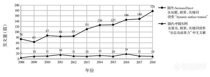 當(dāng)研究的液體吸附過(guò)程在快速、持續(xù)進(jìn)行,且短時(shí)間內(nèi)無(wú)法達(dá)到平衡時(shí),對(duì)液體DST的研究比靜態(tài)表面張力更有意義。如在農(nóng)藥噴灑、噴墨印刷、織物快速潤(rùn)濕,以及攝影用薄膠片制備中。圖1對(duì)比了近10年(2008~2018年)國(guó)內(nèi)外發(fā)表的以DST為主要考察項(xiàng)的論文數(shù)。數(shù)據(jù)顯示國(guó)內(nèi)在DST方面的研究較少且總體波動(dòng)不大,而國(guó)外則呈持續(xù)上升趨勢(shì)。