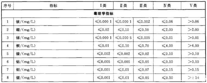 依據(jù)我國(guó)地下水質(zhì)量狀況和人體健康風(fēng)險(xiǎn),參照生活飲用水、工業(yè)、農(nóng)業(yè)等用水質(zhì)量要求,依據(jù)各組分含量高低(pH除外),分為五類(lèi)。