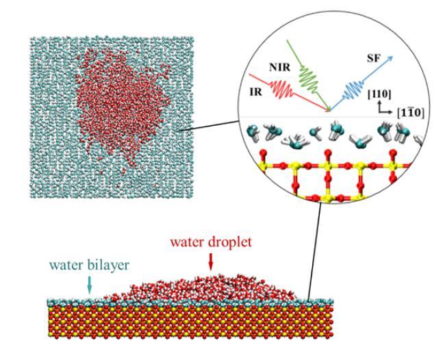 以TiO2的Rutile晶型110表面為例,和頻共振光譜實驗與理論發(fā)現(xiàn)常溫下該表面上有序雙層水結(jié)構(gòu),且該有序結(jié)構(gòu)導(dǎo)致水層上水滴存在。