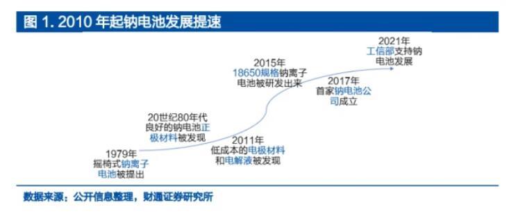 鈉電池隨著產(chǎn)業(yè)化加速,量產(chǎn)在即。1979年法國的Armand提出了“搖椅式電池”的概念,開始鈉離子電池的研究。隨后Delmas和Goodenough發(fā)現(xiàn)了層狀氧化物材料可作為鈉電池正極材料,Stevens和Dahn發(fā)現(xiàn)硬碳材料作為負(fù)極有良好的鈉離子嵌脫性能。2010年以來,鈉電池的研發(fā)進(jìn)程加速。2011年中科院物理所研究員團(tuán)隊開始了鈉離子電池核心技術(shù)的研發(fā),自此以后開發(fā)出低成本的電極材料。2017年國內(nèi)第一家專注于鈉離子電池研發(fā)和生產(chǎn)的公司中科海鈉成立。2021年寧德時代成功舉行了第一代鈉離子電池線上發(fā)布會。2022年,中科海納和傳藝科技均預(yù)計2023年量產(chǎn)其鈉離子電池。