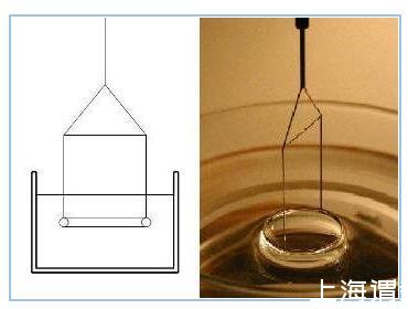 掛環(huán)法(Du Nouy Ring method):這可能是測量表面/界面張力的最經(jīng)典方法,文獻上報道的許多液體的表/界面張力值是用這一方法測得,它甚至可以在很難浸濕的情況下被使用。用一個初始浸在液體的環(huán)從液體中拉出一個液體膜(類似肥皂泡),同時測量提高環(huán)的高度時所需要施加的力。