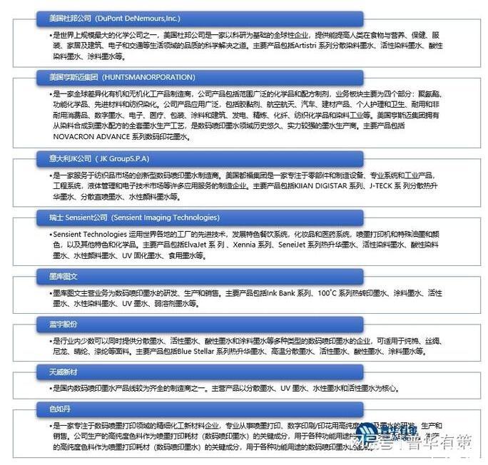 數(shù)碼噴印墨水市場呈現(xiàn)與數(shù)碼印花設(shè)備市場相近的市場競爭格局,由海外巨頭主導(dǎo)市場,如美國杜邦公司、美國亨斯邁集團、意大利JK公司等。從全球范圍來看,目前歐洲、北美地區(qū)的數(shù)碼噴印技術(shù)仍處于較高水平,是率先對數(shù)碼噴墨印花技術(shù)實現(xiàn)產(chǎn)業(yè)化的地區(qū),受益于較高的環(huán)保標準和豐富的時尚原創(chuàng)設(shè)計產(chǎn)業(yè),歐洲、北美地區(qū)的數(shù)碼印花產(chǎn)品供需旺盛,數(shù)碼噴印應(yīng)用產(chǎn)業(yè)規(guī)模大且普及程度高,全球領(lǐng)先的數(shù)碼噴印墨水制造商多集中于此,亞太地區(qū)則以日本、韓國制造商為主。我國的數(shù)碼噴印墨水行業(yè)起步較晚,企業(yè)規(guī)模、研發(fā)能力以及產(chǎn)品穩(wěn)定性等方面參差不齊,且主要以中小型企業(yè)為主,但隨著最近幾年國產(chǎn)數(shù)碼噴印墨水的快速發(fā)展,我國也出現(xiàn)了少數(shù)綜合實力相對較強的專業(yè)生產(chǎn)商。國內(nèi)外主要墨水生產(chǎn)商情況如下: