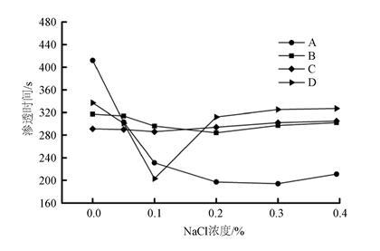 從圖4可知,NaCl對于提高抑塵劑潤濕性能的作用更為顯著。因此,在抑塵劑中加入不同濃度的NaCl,研究無機鹽濃度對煤塵NR的潤濕性能的影響。如圖5所示,少量的NaCl的引入,能夠降低抑塵劑在煤塵表面的滲透時間。NaCl的引入能夠降低抑塵劑溶液的表面張力,使抑塵劑在煤塵表面的接觸角不斷降低[18]。另外,無機鹽能夠增強表面活性物質(zhì)在煤塵表面的吸附能力,降低煤塵與抑塵劑之間的界面能,提高了抑塵劑對煤塵的潤濕性能;煤塵中含有大量的酚羥基、羧基等有機基團,因此煤塵表面呈現(xiàn)電負性[19]。當NaCl含量持續(xù)增加時,抑塵劑A、B、C在煤塵表面的滲透時間趨于平穩(wěn),而抑塵劑D出現(xiàn)滲透時間增加后平緩的趨勢。相比之下,抑塵劑B、C對于NaCl的敏感程度較低,隨著NaCl含量增加其潤濕能力變化不大;NaCl對抑塵劑A、D在煤塵表面的潤濕能力影響程度較大。
