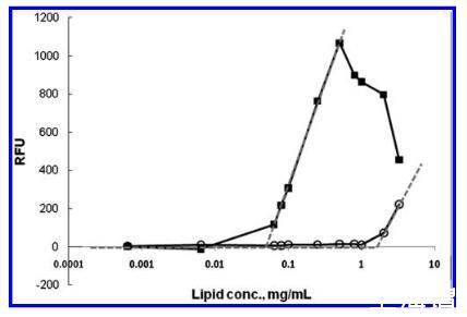 圖2.在不同濃度的脂質(zhì)diC8PS下記錄的熒光發(fā)射,范圍從64μg/mL到3.47 mg/mL。在對照中,添加純DMSO代替測試化合物(O),1.1 mg/mL的急劇上升標志著diC8PS的CMC。將10μL的10 mM硫利達嗪(9)引入基質(zhì)(20 mM HEPES緩沖液中的diC8PS),CMC轉(zhuǎn)移到較低濃度(0.042 mg/mL)。RFU:相對熒光單位。