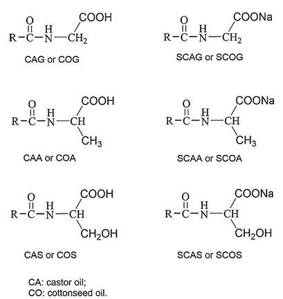 ?;被岜砻婊钚詣?,即相應(yīng)的CAG、COG、CAA、COA、CAS和COS的鈉鹽,通過用NaOH水溶液中和?;被嶂羛H 8-9直至獲得完全澄清的溶液來制備。這些鈉鹽分別命名為SCAG、SCOG、SCAA、SCOA、SCAS和SCOS。