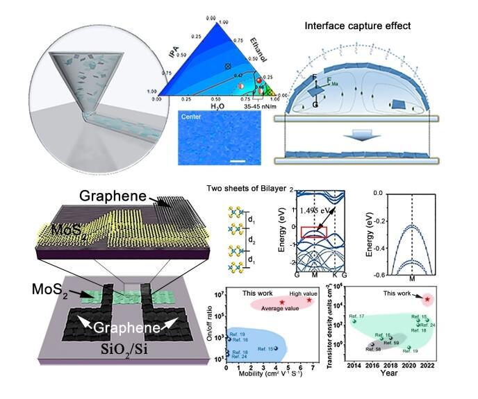近日,化學(xué)所與清華大學(xué)、美國(guó)加州大學(xué)合作,提出了一種界面捕獲效應(yīng)打印策略。該策略使用低沸點(diǎn)水性超分散二維材料油墨,直寫打印二維半導(dǎo)體薄膜陣列,無需添加額外表面活性劑。具體而言,這一策略通過對(duì)剝離的半導(dǎo)體2H-MoS2納米片進(jìn)行分級(jí)離心,獲得了主要為雙層厚度的窄分布納米片;通過建立表面張力和組分比的三溶劑相圖,確定了合適的油墨溶劑。印刷超薄圖案(約3nm厚度)主要以單層或兩層的MoS2納米片連續(xù)均勻排列,并抑制了咖啡環(huán),空隙率較低(約4.9%)。研究使用商用石墨烯作為電極,制備的晶體管在室溫下顯示出6.7 cm2·V-1·s-1的遷移率和2×106的開關(guān)比,超過了此前印刷MoS2薄膜晶體管的性能?;诖?,科研人員制備了高密度(約47000個(gè)/cm2)印刷晶體管陣列。該界面捕獲效應(yīng)打印策略可應(yīng)用于其他2D材料,包括NbSe2、Bi2Se3和黑磷,為印刷二維材料電子器件提供了新方法和新思路。