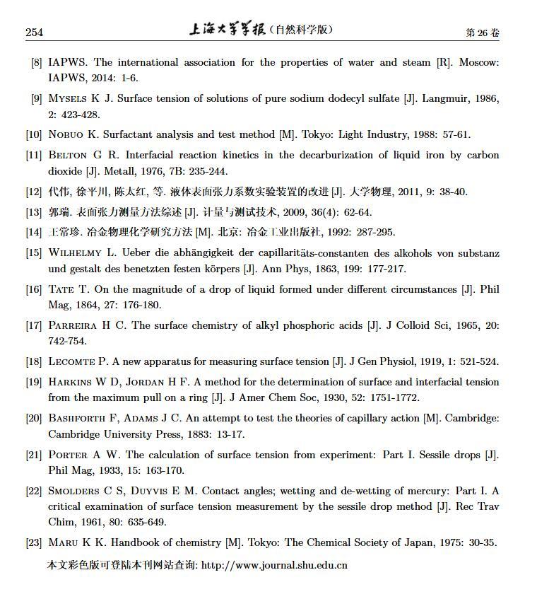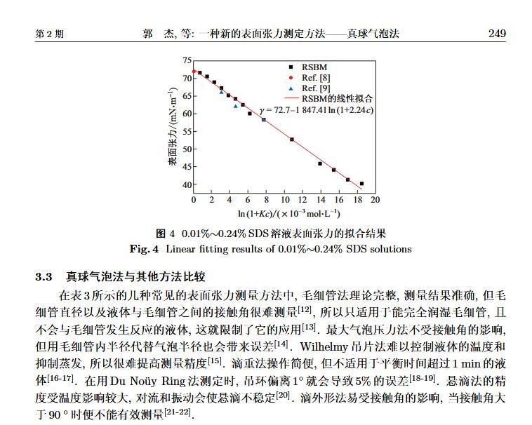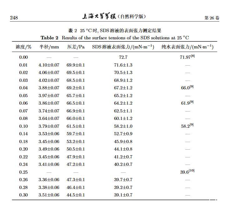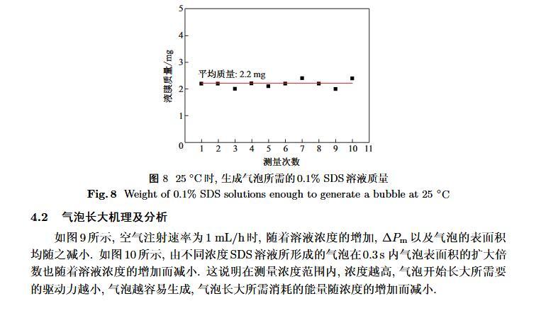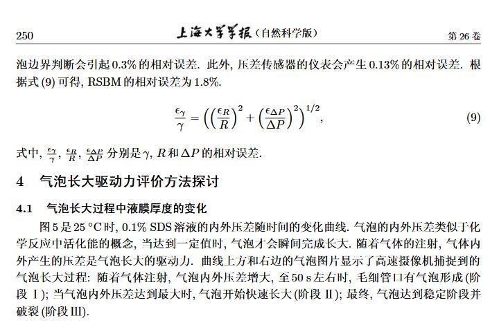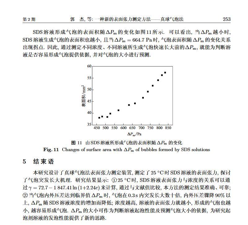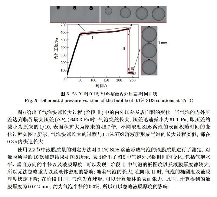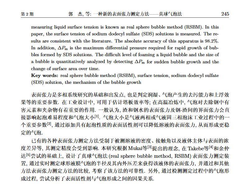 設(shè)計(jì)了一個(gè)新的表面張力測(cè)定裝置,通過(guò)實(shí)時(shí)測(cè)定液膜氣泡的半徑及其內(nèi)外壓差來(lái)獲得被測(cè)液體的表面張力。該測(cè)定液體表面張力的方法簡(jiǎn)稱(chēng)為真球氣泡法(real sphere bubblemethod,RSBM)。對(duì)十二烷基硫酸鈉(sodium dodecyl sulfate,SDS)溶液的表面張力進(jìn)行了測(cè)定,結(jié)果與文獻(xiàn)值吻合,且測(cè)定裝置的絕對(duì)精度為98.2。通過(guò)檢測(cè)到的液膜氣泡突然長(zhǎng)大所需要的最大壓差值及其表面積隨時(shí)間的變化過(guò)程,定量分析溶液起泡難易程度及氣泡大小的關(guān)系。