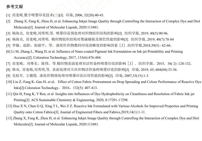 【摘要】:為了研究活性染料墨水黏度和表面張力對棉織物印花性能的影響,配制不同黏度和表面張力的活性紅墨水,測試打印后織物的滲透率、K/S值、墨量及打印線寬等指標(biāo)。結(jié)果表明:提高墨水黏度會降低墨滴在織物上的潤濕和滲透性能,打印到織物的墨量減少,打印清晰度下降。不同黏度的墨水對打印線條經(jīng)緯向的清晰度影響機制不同,表面張力對織物打印性能的影響比黏度小。