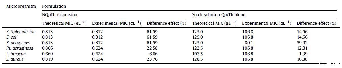 本研究的一個(gè)目標(biāo)是確定對微生物的影響是否是由于組分的協(xié)同或相加作用。通過根據(jù)NQoThs中存在的百分比(QoLMW為75%,Th為25%)對QoLMW和Th的MIC進(jìn)行加權(quán),將NQoThs的MIC與附加效應(yīng)的估計(jì)值進(jìn)行比較。NPs(NQoTh)和QoLMW/Th原液的MIC值均低于基于組分加和效應(yīng)估計(jì)的MIC,表明Qo和Th之間存在協(xié)同效應(yīng)(見表5)。然而,取決于測試的細(xì)菌,NPs的MIC比庫存QoLMW/Th混合物低大約1.5到4.5倍。Wazed Ali、Rajendran和Joshi(2011)評估了使用TPP從440-kDa Qo的1.0%(w/v)溶液中產(chǎn)生的NQo(115.5 nm)的AM抗金黃色葡萄球菌。NQo比Qo原液更有效地抑制這些細(xì)菌的生長50%。