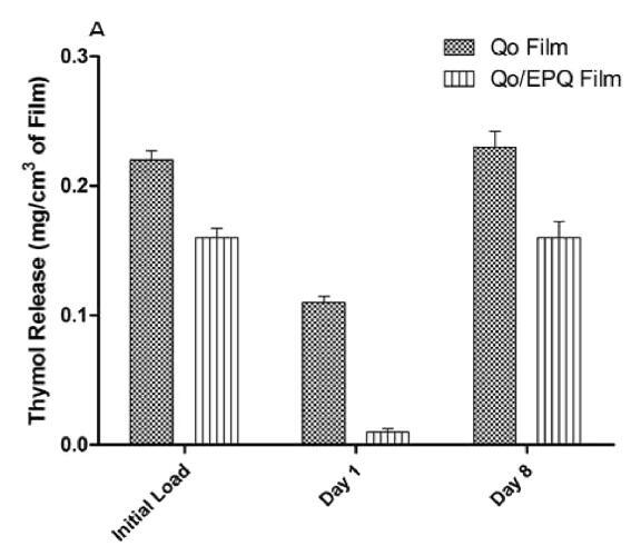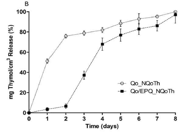 圖6.從使用NQoTh印刷4次的薄膜Qo和Qo/EPQ中釋放百里酚(A)0天(初始負(fù)載Th)、第1天和第8天的釋放曲線和(B)室溫下8天測定的百里酚釋放動(dòng)力學(xué)溫度。