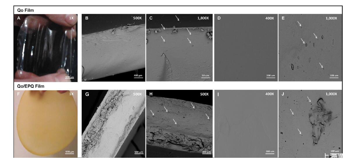 Qo和Qo/EPQ的印刷膜示于圖3A和F。圖3B示出了Qo膜的橫截面,圖3G示出了EPQ/Qo膜的橫截面。Qo膜具有均勻、柔軟、光滑、連續(xù)的結(jié)構(gòu),具有良好的完整性和孔隙。相比之下,混合膜具有帶有孔隙和裂縫的異質(zhì)結(jié)構(gòu)。Qo-乳清蛋白薄膜(Kurek、Galus和Debeaufor,2014年)和Qo-明膠薄膜(Kurek等人,2012年;Rivero、García和Pinotti,2009年;Torres、Aimoli、Beppu和弗雷利希,2005年)。這些作者將這些由碳水化合物和蛋白質(zhì)混合物制備的薄膜的異質(zhì)結(jié)構(gòu)歸因于干燥過程(溶劑前沿的遷移)。Qo/EPQ薄膜的干燥時(shí)間是Qo薄膜的1.8倍,表明水分子通過混合薄膜的擴(kuò)散速度較慢。此外,混合物的pH值(pH 3.8)接近藜麥蛋白的等電點(diǎn)(Abugoch,Romero,Tapia,Rivera,&Silva,2008),這可能會引發(fā)復(fù)雜的凝聚和某些蛋白質(zhì)組分的沉淀,導(dǎo)致Ferreira等人描述的熱力學(xué)不相容性。(2009),當(dāng)乳清蛋白和Qo的混合物被酸化以獲得混合膜時(shí),他觀察到了這種現(xiàn)象。