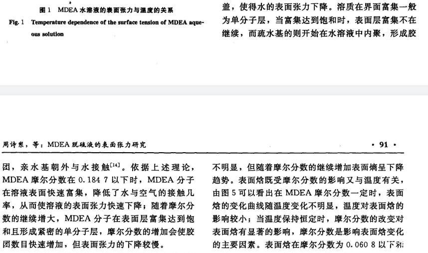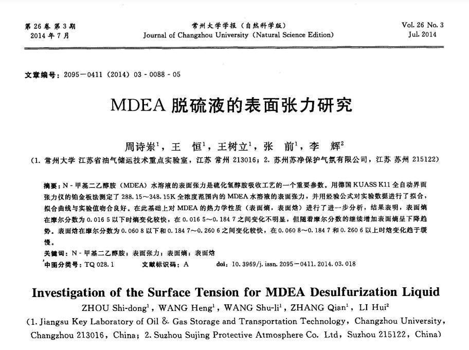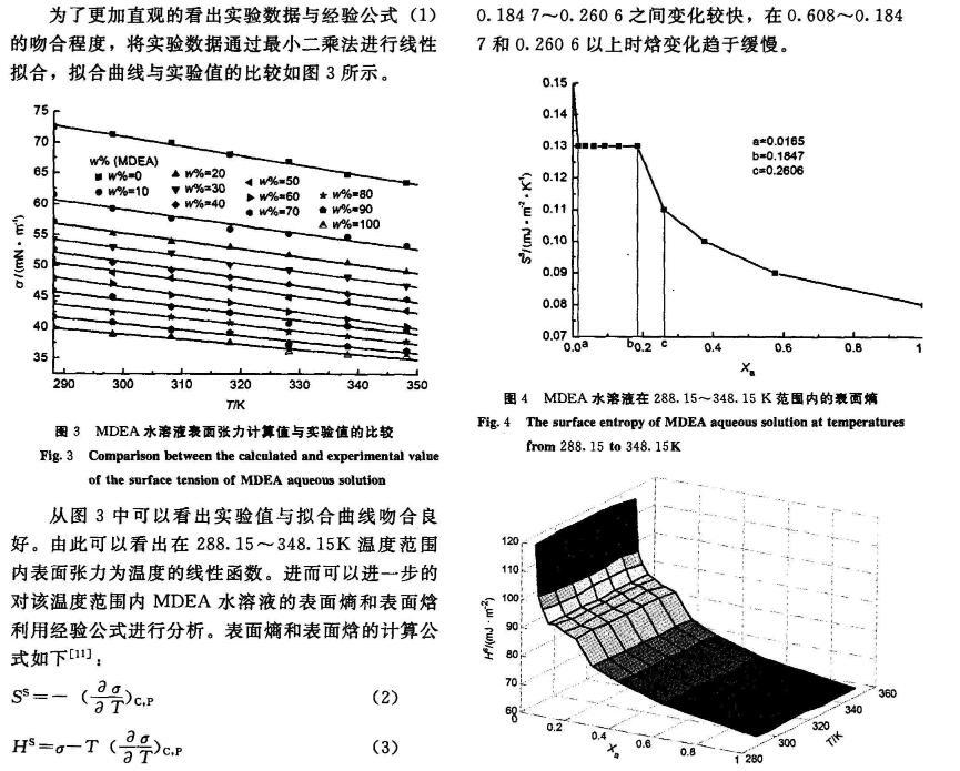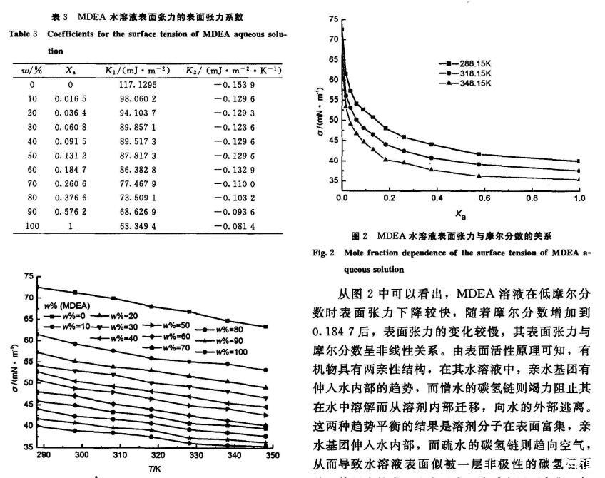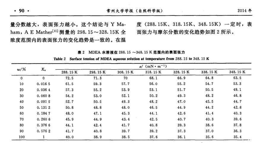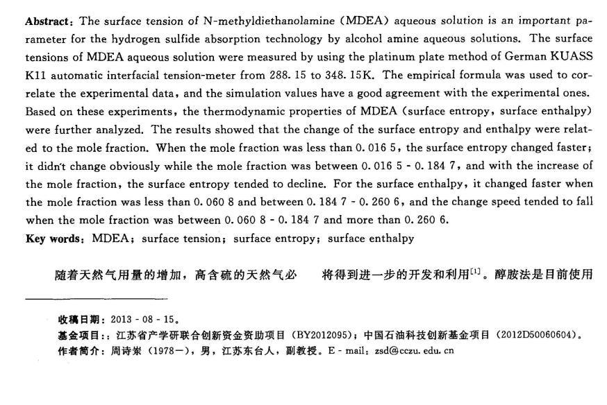 【摘要】:N-甲基二乙醇胺(MDEA)水溶液的表面張力是硫化氫醇胺吸收工藝的一個(gè)重要參數(shù)。用德國(guó)KUASS K11全自動(dòng)界面張力儀的鉑金板法測(cè)定了288.15~348.15K全濃度范圍內(nèi)的MDEA水溶液的表面張力,并用經(jīng)驗(yàn)公式對(duì)實(shí)驗(yàn)數(shù)據(jù)進(jìn)行了擬合,擬合曲線與實(shí)驗(yàn)值吻合良好。在此基礎(chǔ)上對(duì)MDEA的熱力學(xué)性質(zhì)(表面熵,表面焓)進(jìn)行了進(jìn)一步分析,結(jié)果表明,表面熵在摩爾分?jǐn)?shù)為0.016 5以下時(shí)熵變化較快,在0.016 5~0.184 7之間變化不明顯,但隨著摩爾分?jǐn)?shù)的繼續(xù)增加表面熵呈下降趨勢(shì)。表面焓在摩爾分?jǐn)?shù)為0.060 8以下和0.184 7~0.260 6之間變化較快,在0.060 8~0.184 7和0.260 6以上時(shí)焓變化趨于緩慢。