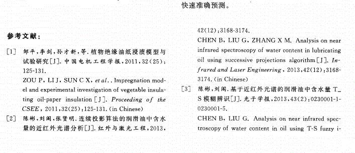【摘要】:為了有效監(jiān)控絕緣油的運(yùn)行狀態(tài),采用定量分析方法探討了微量水分對絕緣油表面張力的影響規(guī)律。通過配制不同微水含量的絕緣油樣,對每組油樣進(jìn)行表面張力測試,然后對油樣進(jìn)行紅外光譜掃描,獲取了油樣中水分在特征波數(shù)處(1 640,3 400,3 450,3 615cm-1)的吸光度值。分析了油液中2,6-二叔丁基對甲酚(T501)等添加劑對油樣表面張力變化規(guī)律的影響。結(jié)果表明:油樣中水分含量與水分特征吸光度值之間有較好的相關(guān)性(相關(guān)系數(shù)分別為0.964 1,0.984 8,0.984 5,0.944 0),油樣表面張力和1 640,3 400,3 450,3 615,3 650cm-1波數(shù)處油樣吸光度值的變化亦均呈現(xiàn)良好的正相關(guān)性。建立了油樣表面張力與特征波數(shù)處油樣吸光度值的多元線性回歸模型,擬合精度為0.992 8;根據(jù)模型得到的表面張力計(jì)算值與實(shí)際測量值誤差為-0.07~0.06%,吻合性較好。文中的實(shí)驗(yàn)可為含微水絕緣油的表面張力檢測提供理論支撐。