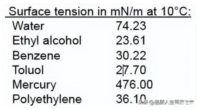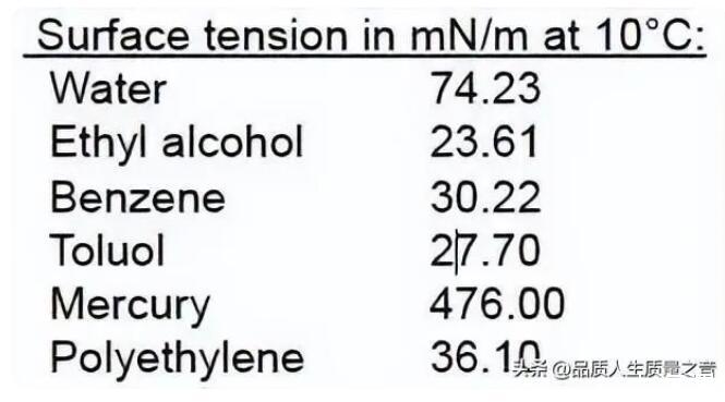 比如下面表格在10攝氏度時不同液體的表面張力差異很大